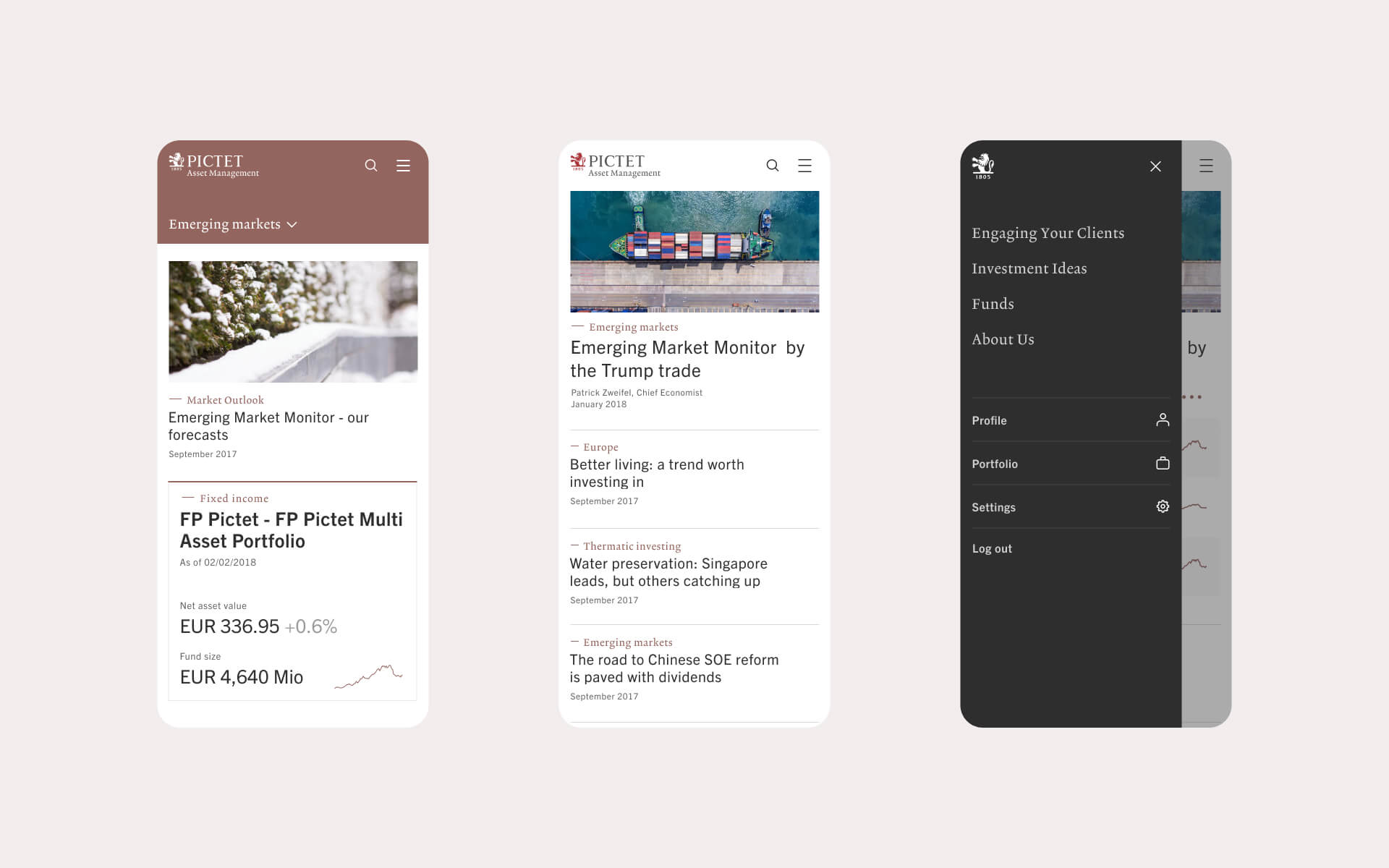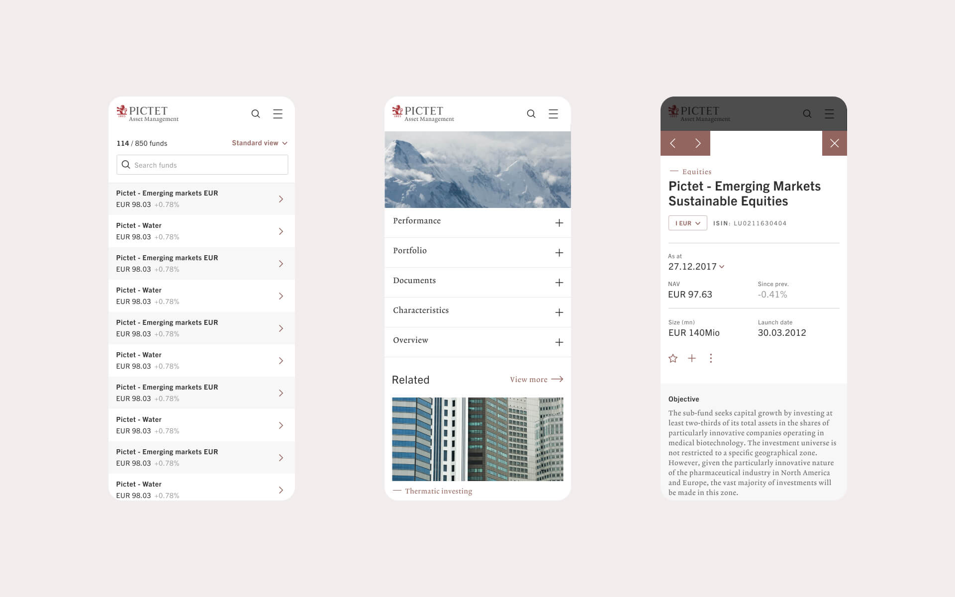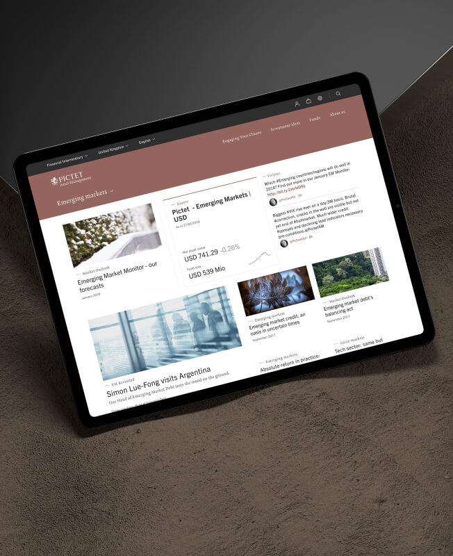 Pictet Asset Management helps clients make sense of global markets for long term investments. Working with Scheÿbeler studio, my role was to lead the UI design refresh for the tool based on the Pictet brand guidelines and UX work set out by collaborator Studio Howells. I defined new digital UI principles including typography, color palette, grid structure for clear hierarchy.