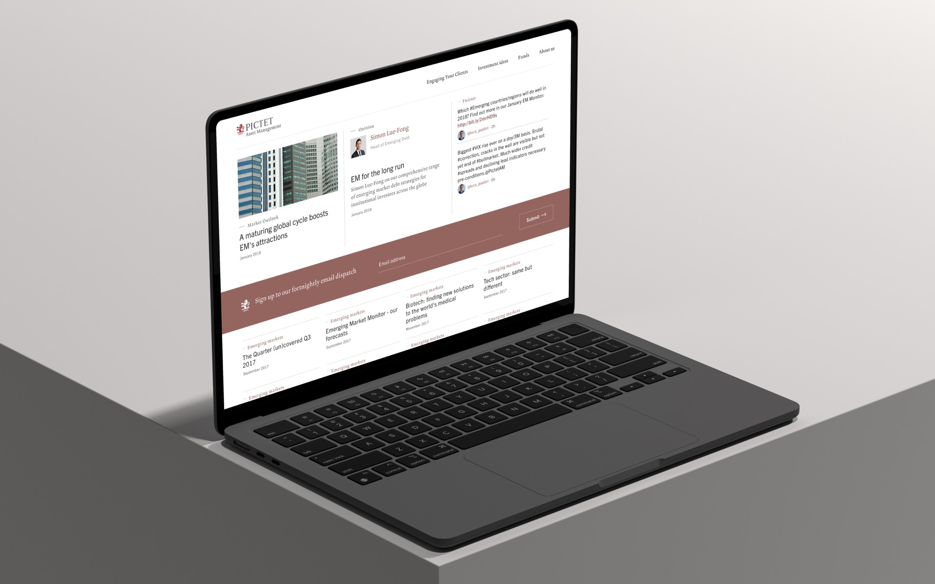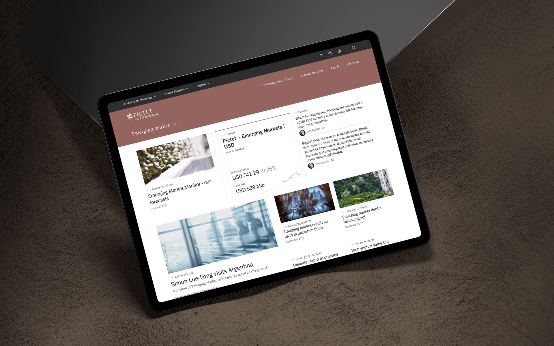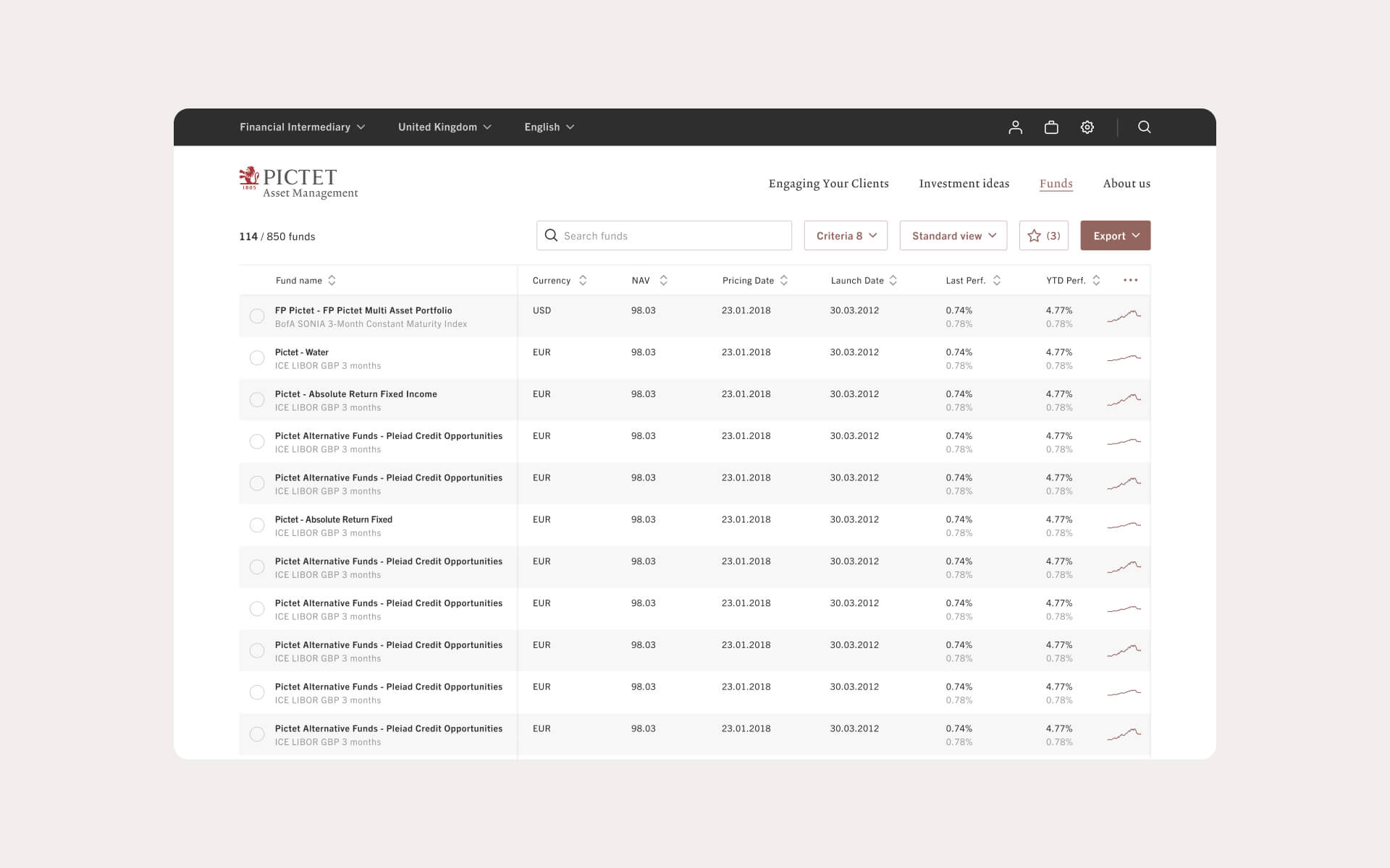 Pictet Asset Management helps clients make sense of global markets for long term investments. Working with Scheÿbeler studio, my role was to lead the UI design refresh for the tool based on the Pictet brand guidelines and UX work set out by collaborator Studio Howells. I defined new digital UI principles including typography, color palette, grid structure for clear hierarchy.
